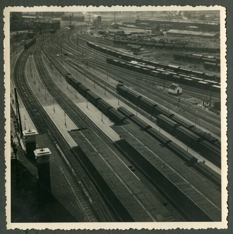 De foto toont de uitgebreide sporenbundel van het station. Vooraan zien we de perrons, gedeeltelijk overdekt met luifels. Aan enkele perrons en in de bundel staan verschillende reizigers- en goederentreinen. Tussen de sporen staat ook een seinpost. Schenking van Herman Welter.