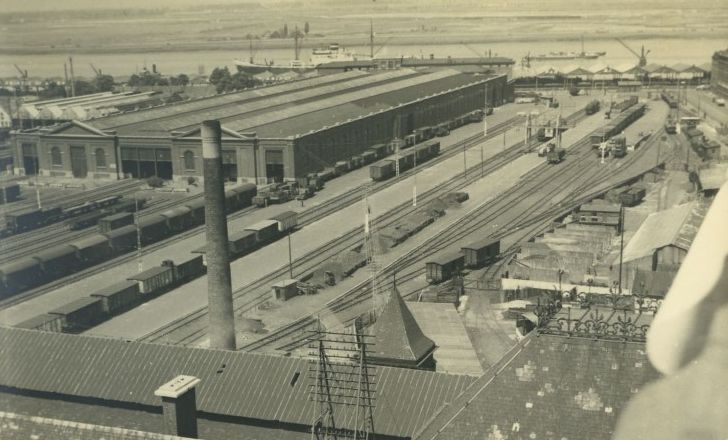 De foto toont de goederenloods met sporen ervoor en ernaast. Op de sporen staan verschillende goederentreinen. Naast de loods kunnen we nog net de stelplaats voor stoomlocomotieven zien. In de achtergrond zien we de Haven van Antwerpen. Deze foto werd genomen van uit de toren van het station. Schenking van Herman Welter.
