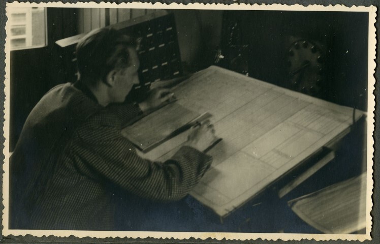 De regelaar regelt het treinverkeer. We zien dhr. Van De Velde aan het werk. Op de tafel ligt een papier met dienstregelingstabellen. Rondom staan verschillende telefoons, een grote telefooncentrale en een klok.