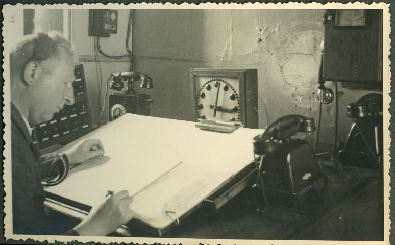 De regelaar regelt het treinverkeer. We zien dhr. Buydts aan het werk. Op de tafel ligt een papier met dienstregelingstabellen. Rondom staan verschillende telefoons, een grote telefooncentrale en een klok.