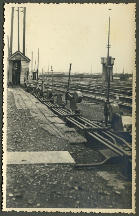 La petite cabine de signalisation se trouve au milieu du faisceau de voies. Devant la cabine il y a différents leviers avec contrepoids pour la manœuvre des aiguillages. Le signaleur pose dans l’entrée. Au fond, on voit un château d'eau. Don de Herman Welter.