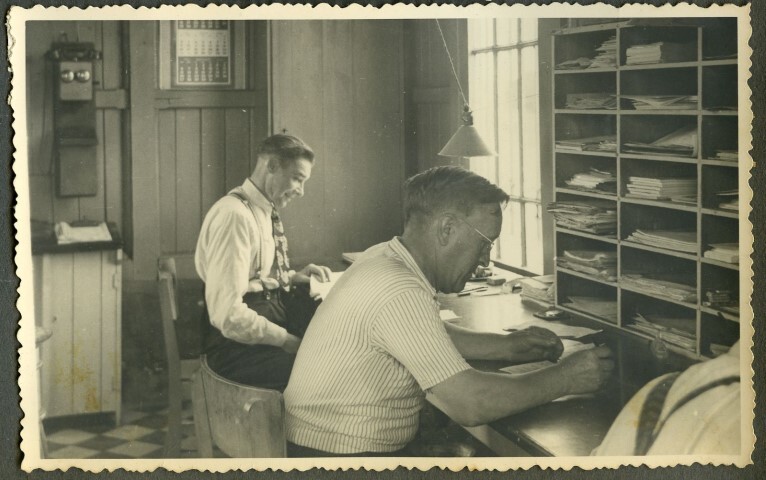 Op de foto zien we het kantoor van de factage. Eén wand bestaat uit een vakjeskast om post en dossiers te klasseren. Aan de andere muur hangt een diensttelefoon. Twee medewerkers, A. Herman en C. Obijn, zijn aan het werk. Schenking van Herman Welter.
