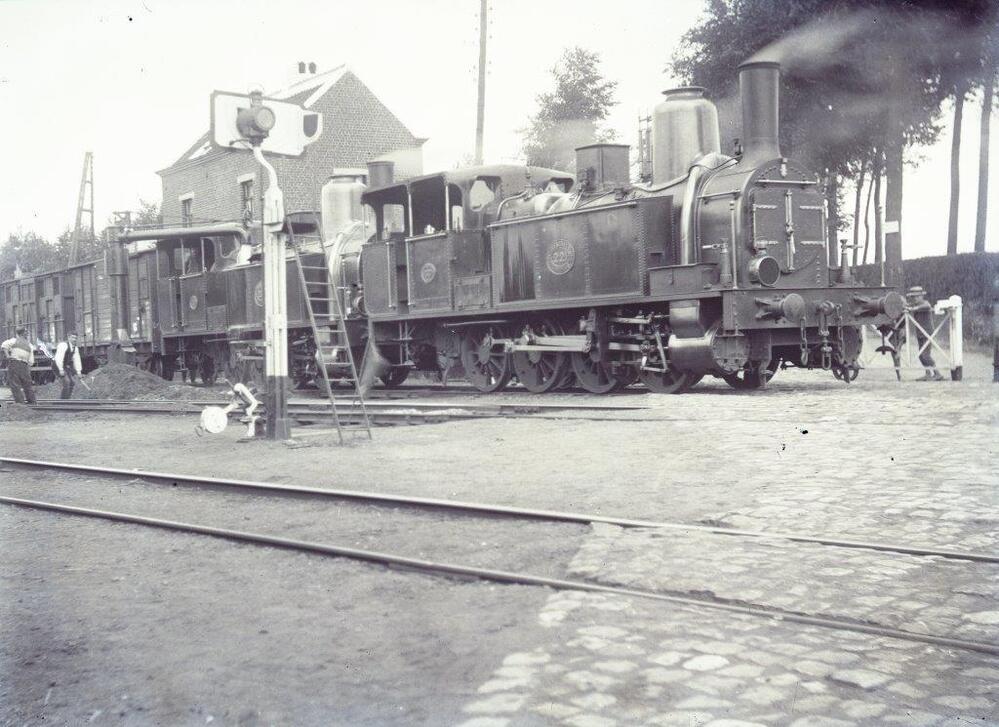 Stoomlocomotief 221 (Dt) werd gebouwd in 1874 door locomotiefbouwer Graffenstaden. De locomotief verzekerde, als eerste locomotief, de trekkracht voor een zware goederentrein. De tweede locomotief is het nummer 212, die behoorde tot dezelfde locomotiefreeks (nrs. 200 tot 223). De foto werd gemaakt rond 1910, tijdens het bijvullen van de waterreservoirs in het station Ottignies. Voor de goederentrein zien we een mechanisch sein en een handel voor het manueel bedienen van een wissel. Twee spoorleggers bedekken de dwarsliggers met ballast. Achter de locomotief zien we nog net de rolbareel van een overweg.