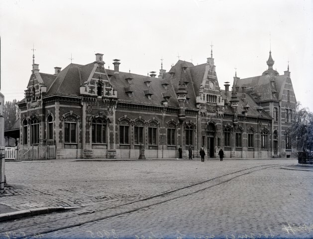 De foto toont de voorgevel van het gebouw in Vlaamse neorenaissancestijl met speklagen, zadeldak, vooruitspringende puntgevels, torentjes en dakkapellen. Op het gelijkvloers hebben de ramen en deuren bovenaan halfronde bogen. Voorbijgangers poseren voor de fotograaf. Op de voorgrond zien we de rails van de buurtspoorweg Zinnik - Edingen.