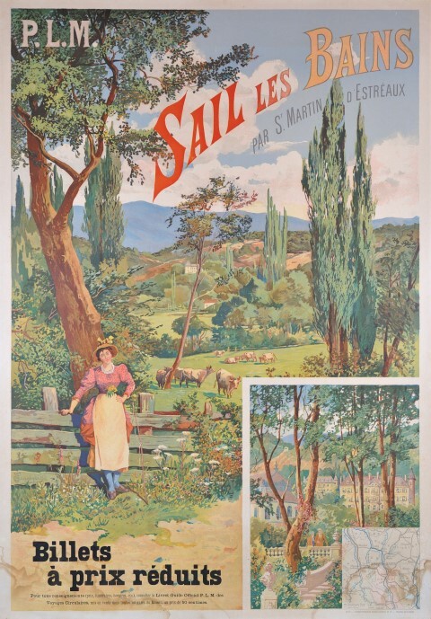 Dit is een affiche van de Compagnie des chemins de fer de Paris à Lyon et à la Méditerranée. We zien een idyllisch landschap met een vrouw in klederdracht en koeien in de weide. Rechtsonder is een kleinere afbeelding van het Franse plaatsje Sail-les-Bains en een netkaart. Onderaan links staat mee ruitleg: 'Billets à prix réduits Pour tous renseignements (prix, itinéraires, horaires, etc.), consulter le Livret Guide Officiel de P.L.M. des Voyages Circulaires, mis en vente dans toutes les gares du Réseau, au prix de 50 centimes.' Bovenaan links staat 'P.L.M.' Schenking Astoria Brussels.