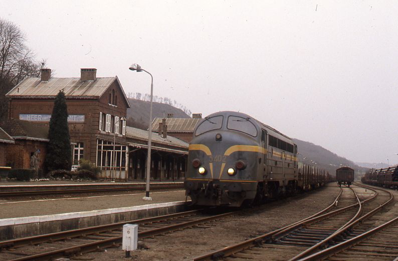 Deze fotogroep bevat twee dia's. Diesellocomotief 5402 sleept een goederentrein bestaande uit platte wagens met rongen. Op de eerste foto zien we de trein in het station Heer-Agimont. We zien het stationsgebouw en andere goederenwagens in de sporenbundel. Op de tweede dia rijdt de trein op spoorlijn 154 (Namen - Dinant - Heer-Agimont - Franse grens). Schenking van Myriam Hendrickx.
