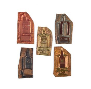 BeschrijvingDeze vijf metalen clichés tonen verschillende onderdelen van het aandenken in spiegelbeeld. We zien een afbeelding van Big Ben en onderaan het opschrift 'London 1954 IRCA'.