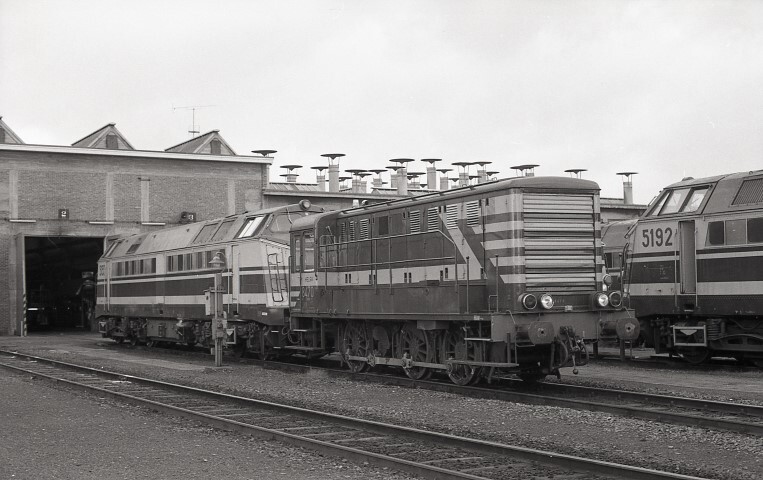 Deze locomotief behoort tot de reeks 84. Ze staat opgesteld voor de werkplaats van Hasselt. Achter en naast deze locomotief staan locomotieven opgesteld van de reeks 51. Op het dak van de werkplaats zijn verluchtingspijpen te zien, zij voeren de verbrandingsgassen van de in proef draaiende locomotieven naar buiten. Schenking van Myriam Hendrickx.