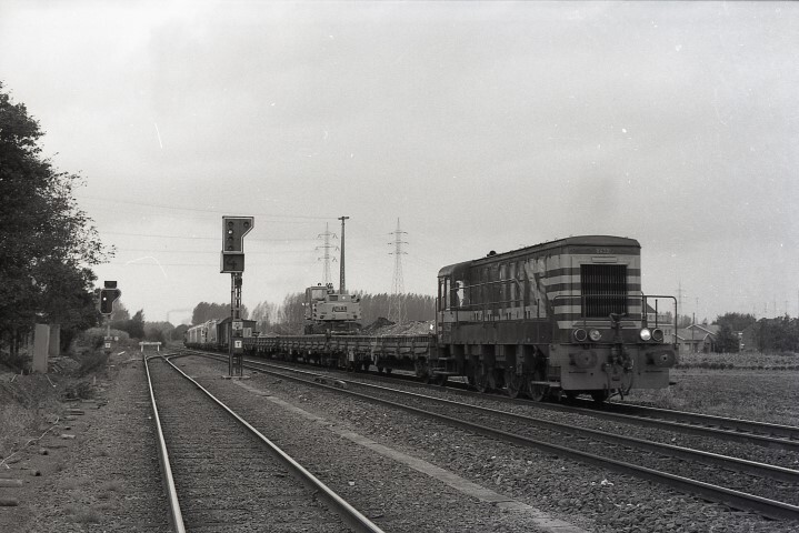 Deze locomotief behoort tot de reeks 84. Ze sleept een werktrein over spoorlijn 34 (Luik - Tongeren - Hasselt). Links zien we het spoor van lijn 21C (Bilzen - Winterslag) met ernaast twee lichtstopseinen. Het uiterste linkse is van het type II, dat tussen de sporen is van het type III. Verder zien we op het einde van het doodlopend spoor een stootjuk. Schenking van Myriam Hendrickx.