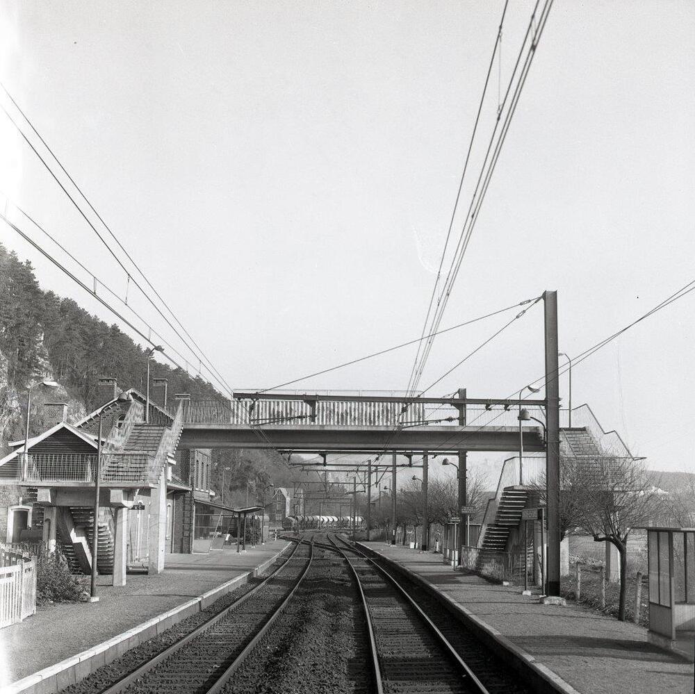 BeschrijvingWe zien de perrons, de voetgangersbrug, de sporen en de schuilhuisjes van station Marche-les-Dames, gelegen langs spoorlijn 125 (Namen - Luik). Sinds 1993 is het een onbewaakte stopplaats.