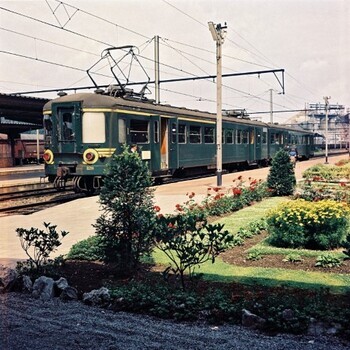 BeschrijvingDe foto toont motorstel 128 (reeks 00, schijf 1954) in groene livrei met gele zichtbaarheidsstrepen. Het bebloemde perron is uitgerust met elektrische verlichting. Op perron 2 en 3 staan luifels.