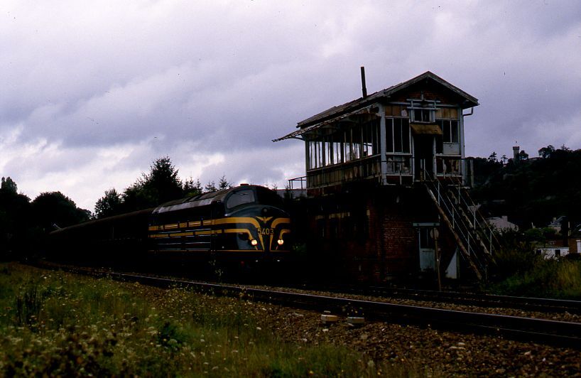 BeschrijvingDiesellocomotief 5403 sleept een reizigerstrein samengesteld uit K-rijtuigen. De trein rijdt voorbij een seinhuis dat al een tijdje buiten dienst is gesteld.