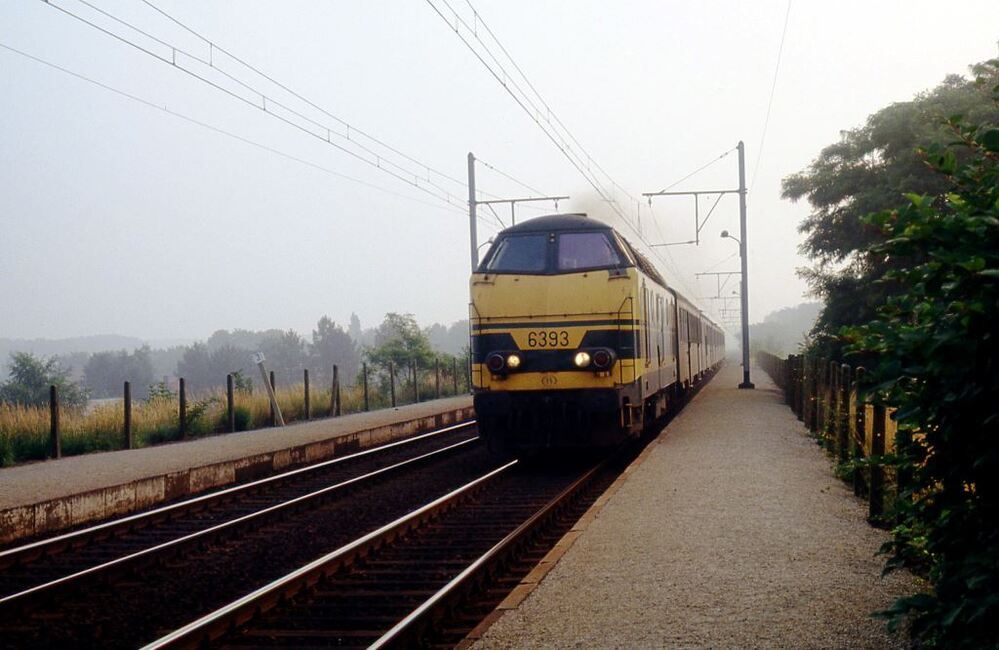Diesellocomotief 6393 komt met een reizigerstrein aan in de stopplaats Hofstade. De sleep bestaat uit M 2-rijtuigen. Op de perrons staan verlichting en een (scheve) hectometerpaal '3'. Stopplaats Hofstade ligt langs spoorlijn 57 (Dendermonde - Lokeren). Schenking van Myriam Hendrickx.
