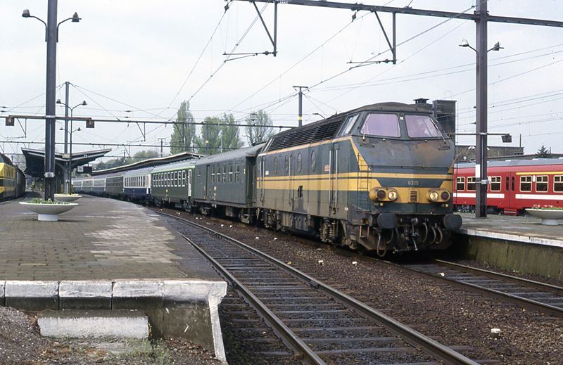 De locomotief is groen geschilderd met gele zichtbaarheidsstrepen. De nummering bestaat uit kleine cijfers. De perrons zijn met elektrische verlichting, luifels, vertreklichten en bloemenvazen uitgerust. Rechts zien we een motorstel Break in bordeaux kleur met een brede witte band. Schenking van Myriam Hendrickx.