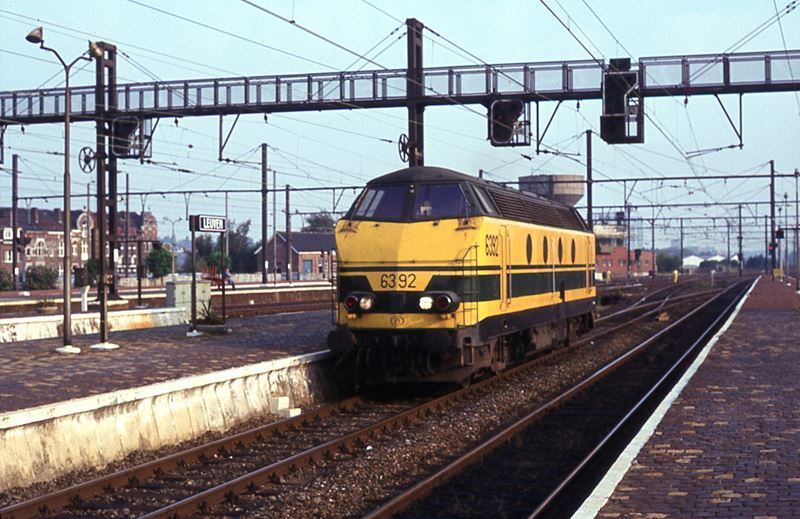 Diesellocomotief 6392 wacht op een volgende rit aan het perron in station Leuven. Op de perrons zien we verlichting en een stationsnaambord. Boven de sporen hangt een lichtseinenbrug.