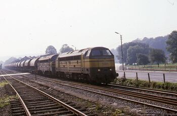 BeschrijvingTwee diesellocomotieven van de reeks 53 slepen een lange goederentrein bestaande uit stortwagens.