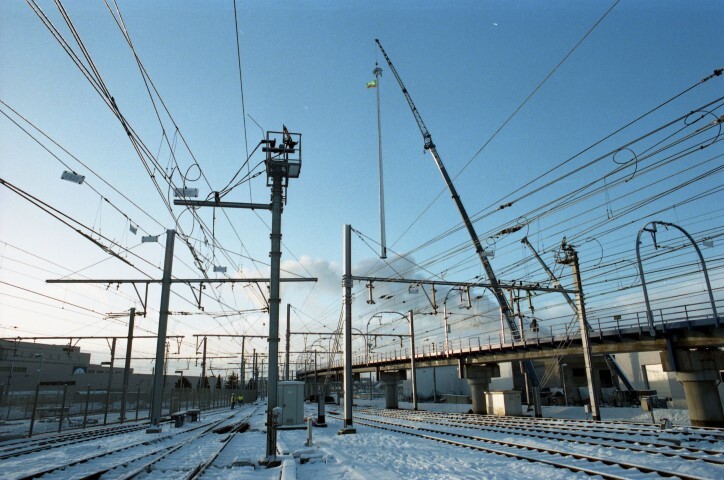 De fotogroep bevat 37 negatieven. Met behulp van een telescoopkraan wordt een verlichtingsmast naast de besneeuwde inrijsporen van de rijtuigenbundel van Vorst geplaatst. Techniekers verankeren de voet van de mast in de fundering van de bodemplaat. Rechts zien we de fly-over van lijn 96D (Brussel-Zuid – Y Ruisbroek). Naast de wissels staan gasflessen om te voorkomen dat de wisseltongen vastvriezen.