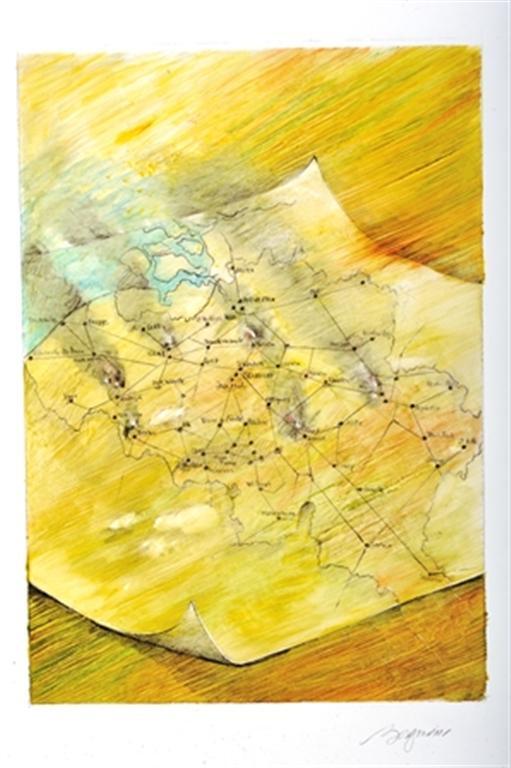Deze tekening van een Belgische spoorwegenkaart werd in geel-, oranje- en roodtinten uitgevoerd, met blauwe en zwarte accenten. De kaart ligt op een ondergrond en heeft een ezelsoor. Uit enkele belangrijke vormingsstations, depots en werkplaatsen komen rookpluimen tevoorschijn.