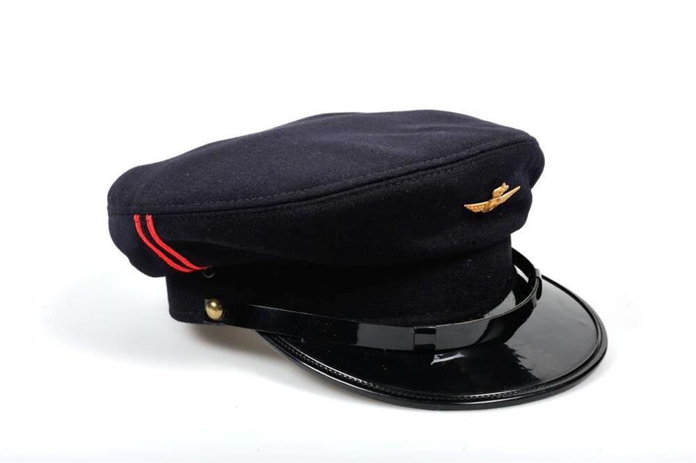 Donkerblauwe dienstpet met een zwarte klep in kunststof. De stormband is van kunststof en vastgemaakt met ronde metalen knopen. Aan beide zijden loopt een dubbele rode verticale streep. Vooraan is een spoorweginsigne bevestigd. De pet is versterkt met een leren band en de voering is geel.