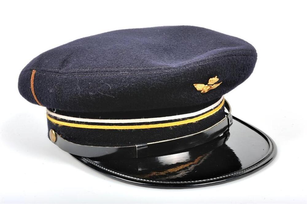 BeschrijvingDonkerblauwe dienstpet met een zwarte klep in kunststof. De stormband is van kunststof en vastgemaakt met ronde metalen knopen. Er loopt een gele en witte bies op 2 centimeter boven de rand. Aan beide zijden loopt een enkele bruine verticale streep. Vooraan is een spoorweginsigne bevestigd. De pet is versterkt met een leren band en de voering is grijs.