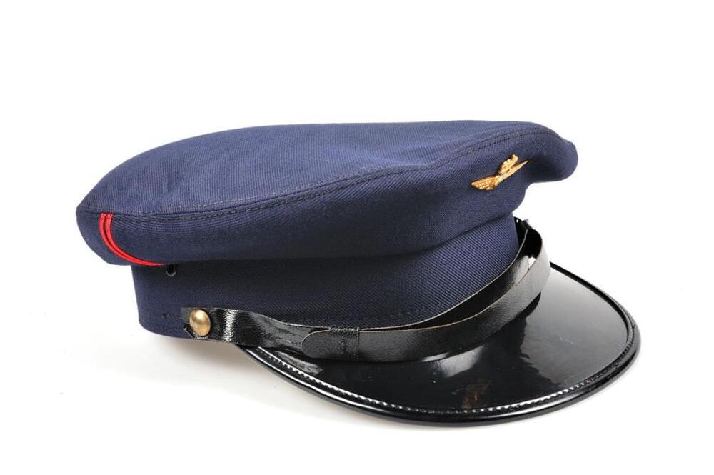 Donkerblauwe dienstpet met een zwarte klep in kunststof. De stormband is van leer en vastgemaakt met ronde metalen knopen. Aan beide zijden loopt een dubbele rode verticale streep. Vooraan is een spoorweginsigne bevestigd. De pet is versterkt met een leren band en de voering is zwart. Ze werd in verschillende maten bewaard.