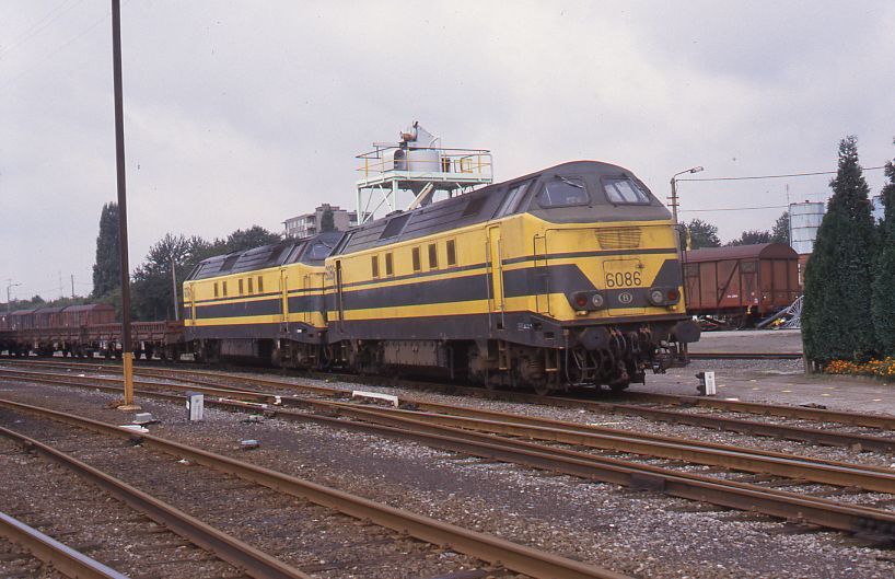 Deze fotogroep bevat negen dia's. Ze tonen twee diesellocomotieven reeks 60/61 in de bundel van station Mol. Samen slepen de locomotieven een goederentrein samengesteld uit platte wagens met rongen. In de bundel zien we diesellocomotief 5185 op kop van een trein beladen met containers. De locomotieven zijn geel geschilderd met brede groene banden. Schenking van Myriam Hendrickx.