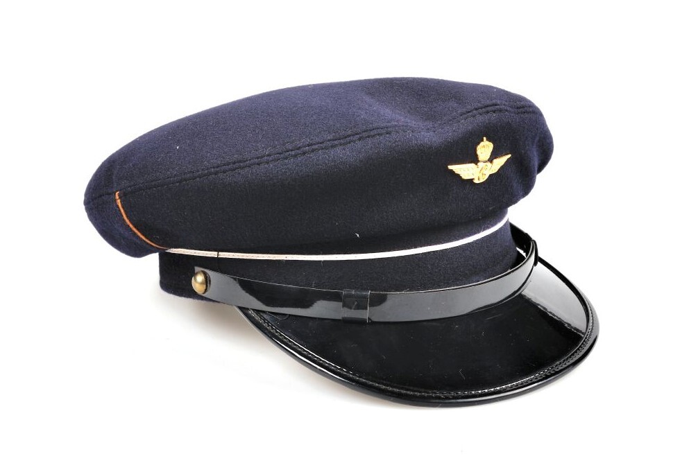Donkerblauwe dienstpet met zwarte klep in kunststof. De stormband is van kunststof en vastgemaakt met twee metalen knopen. Er loopt een witte bies op 2 centimeter boven de rand. Aan beide zijden loopt een enkele bruine verticale streep. Vooraan is een spoorweginsigne bevestigd. De pet is verstevigd met een leren band en de voering is beige.