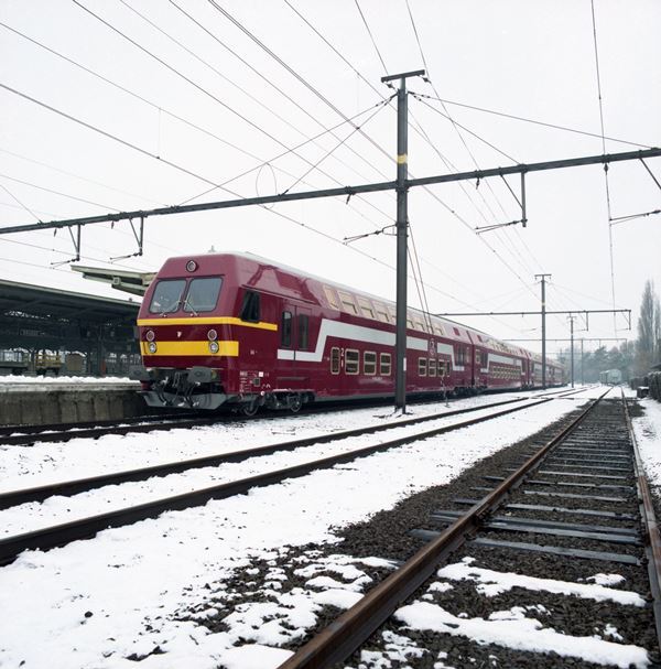 Een trein, samengesteld uit M 5-dubbeldekrijtuigen, staat aan het perron in station Brugge in de sneeuw. De rijtuigen zijn bordeaux geschilderd met een brede witte band. Het stuurstandrijtuig heeft gele zichtbaarheidsstrepen. Het perron is uitgerust met luifels en een stationsnaambord.