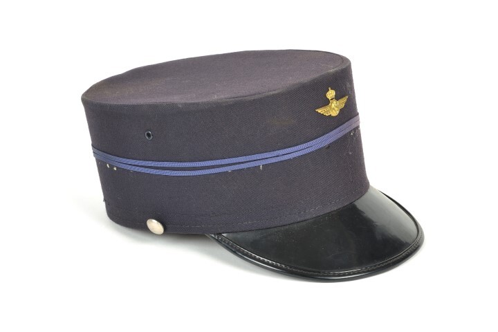 Donkerblauwe kepie met een zwarte klep in kunststof. De stormband ontbreekt. Er lopen twee blauwe biezen op 4 en 5 cm van de rand. Vooraan is een spoorweginsigne bevestigd. De kepie is versterkt met een leren band. De voering is beige.