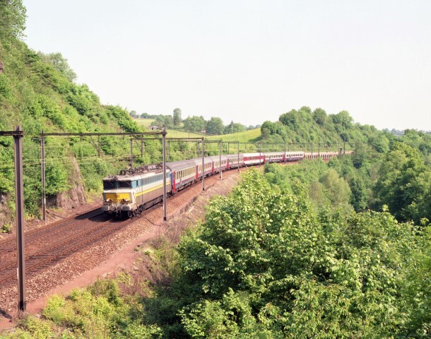 De foto toont locomotief 1806 in lichtgrijze livrei met blauwe band en gele zichtbaarheidsstrepen. Ze sleept een trein samengesteld uit vier I 6-rijtuigen tweede klas, een rijtuig van vermoedelijk de Deutsche Bahn en twee I 6-rijtuigen eerste klas.