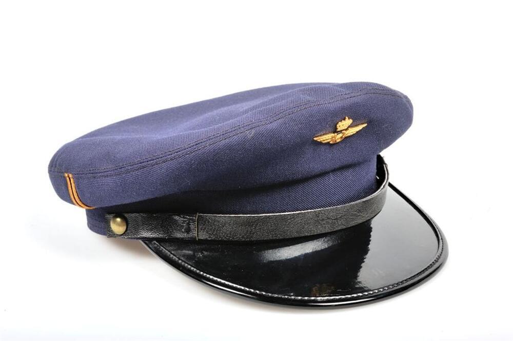 BeschrijvingDonkerblauwe dienstpet met zwarte klep in kunststof. De stormband is van leer en vastgemaakt met twee metalen knopen. Er loopt een dubbele bruine verticale streep aan beide zijden. Vooraan is een spoorweginsigne bevestigd. De pet is verstevigd met een leren band en de voering is zwart.