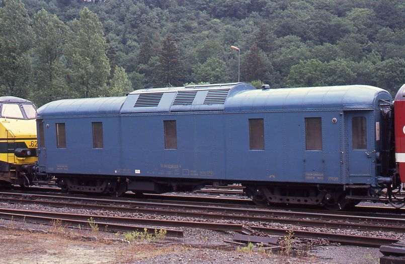 Een generatorpakwagen wordt gesleept door een diesellocomotief reeks 62/63. Deze wagen werd gebruikt voor de verwarming van rijtuigen. Ze maakte deel uit van een reeks van zes omgebouwde internationale pakwagens uit 1933 en 1935. Schenking van Myriam Hendrickx.