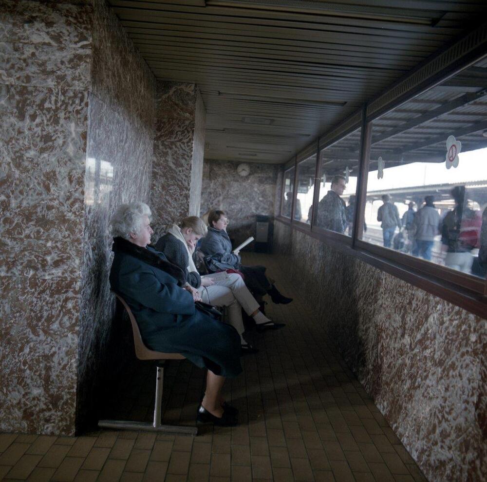 De fotogroep bevat vier negatieven. Foto A is een binnenzicht van de wachtzaal gelegen op perron 1. De wachtzaal is uitgerust met zitbanken en een klok. Op de andere foto's zien we de buitenzijde van deze wachtzaal, met rechts daarvan een buffet. Reizigers konden zo van op het perron een drankje bestellen. Perron 1 is overdekt met een luifel met elektrische verlichting, die aan de achtergevel van het stationsgebouw is bevestigd.