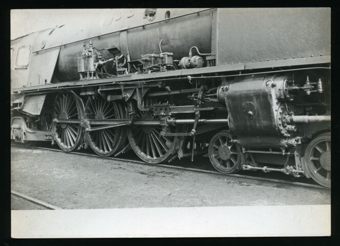 Op de postkaart staat een detailfoto van een stoomlocomotief type 1 (2C1 Pacific). We zien duidelijk de wielen, de cilinders en de drijfstangen. Achteraan staat ‘Photo B. Dedoncker – A.B.A.C. Reproduction interdite sans autorisation 4466’. De postkaart werd nooit verzonden. Schenking van Philippe Adam.