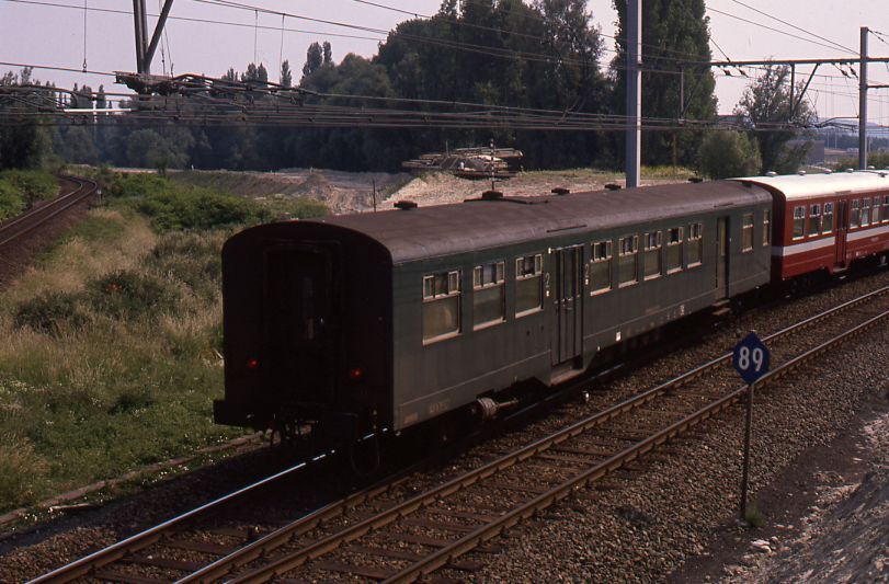 Een M 2-bagagerijtuig hangt aan het einde van een trein in zijn oorspronklijke donkergroene kleur. Ervoor zien we een M 2-rijtuig in de nieuwe bordeaux livrei. Rechts langs het spoor staat een blauw bord waarop het nummer van de lijn (89) is aangeduid. Schenking van Myriam Hendrickx.