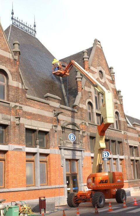 De groep bevat 29 digitale foto's. De gevels van het stationsgebouw in Vlaamse neorenaissancestijl worden gerenoveerd. Arbeiders zijn aan het werk op een hoogtewerker. Het interieur van de stationshal is al gerenoveerd. We zien reizigers wachten aan het vernieuwde loket. Het plafond wordt gedragen door een constructie in smeedijzer.
