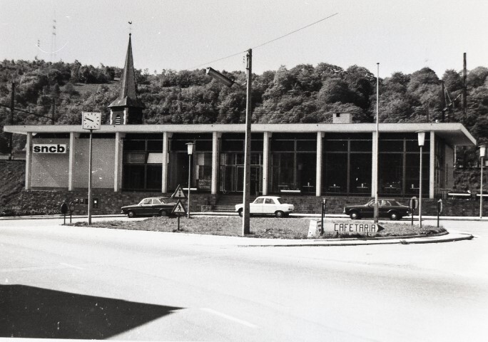 De foto toont het gebouw aan de straatzijde. Het heeft een uitspringende dakrand die steunt op kolommen. Tussen twee kolommen hangt een bord met het opschrift 'SNCB' (Société nationale des chemins de fer belges). Op de rotonde zien we de stationsklok. Voor het gebouw staan auto's geparkeerd.