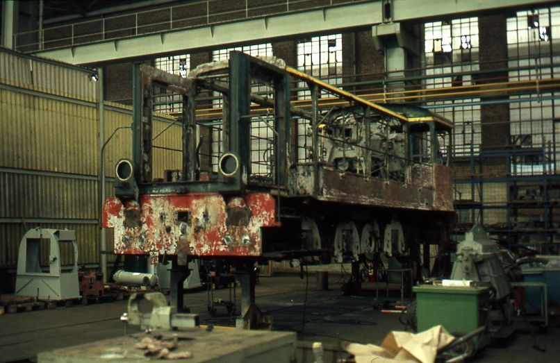 De foto toont een rangeerlocomotief nadat ze opgevijzeld werd. De motor en wielen zijn verwijderd. Met uitzondering van de stuurpost is de kast van de locomotief volledig ontmanteld.