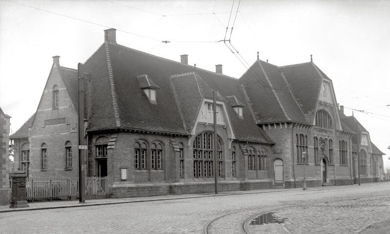 De foto toont de voor- en zijgevel van het tweede stationsgebouw met een vooruitspringende ingang. Het hoog zadeldak wordt door drie wolfsdaken onderbroken. Voor het station zien we de sporen en bovenleiding van de voormalige tramlijn 21 die tussen Adinkerke en De Panne reed.