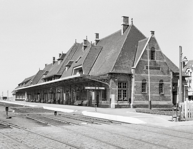 Deze fotogroep bestaat uit twee negatieven. Ze tonen het tweede stationsgebouw aan de kant van de sporen met een luifel uit gietijzerwerk. Het hoog zadeldak wordt door twee wolfsdaken onderbroken. De perrons zijn uitgerust met elektrische verlichting, zitbanken en een stationsnaambord. Om het perron aan de overzijde van het station te bereiken, moeten de reizigers onder begeleiding van een personeelslid van de gelijkgrondse kruising van de sporen gebruik maken. Naast de sporen staan grondseinen. Op de voorgrond zien we een overweg.