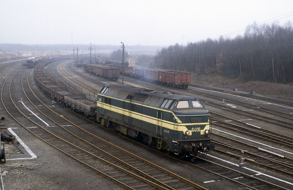 Deze fotogroep bevat 18 dia's. Diesellocomotief 6406 sleept een goederentrein bestaande uit platte wagens met rongen. De trein rijdt door de sporenbundel, waar we ook andere goederenwagens zien, en voorbij het station Winterslag. Schenking van Myriam Hendrickx.