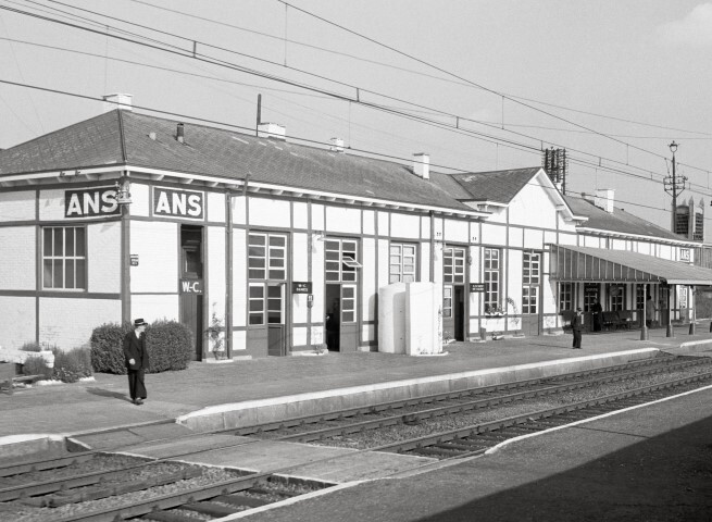 Deze fotogroep bestaat uit twee negatieven. Ze tonen het station aan de kant van de sporen. Het zadeldak wordt centraal door een fronton bekroond. Het gebouw is opgetrokken uit een houten vakwerk, opgevuld met bakstenen. Tegen de zij- en achtergevel hangen naamborden. Het perron is uitgerust met een luifel in glas en staal, elektrische verlichting, een stationsklok, zitbanken en een schuilkelder. Om het perron aan de overkant te bereiken, moeten de reizigers, onder begeleiding van een personeelslid, gebruik maken van een gelijkgrondse kruising met de sporen. Een spoorbeambte kijkt voorzichtig om zich heen vooraleer de sporen over te steken.