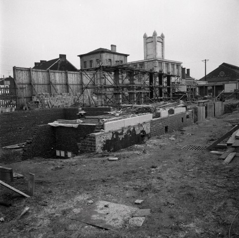 BeschrijvingDeze fotogroep bestaat uit vier negatieven. Ze tonen de werken aan de funderingen en een zijvleugel van het nieuwe stationsgebouw. We zien de bekisting van de betonnen zuilen van de inkomhal.