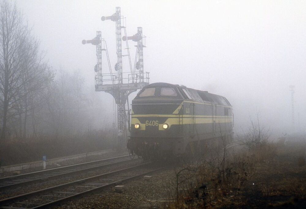 BeschrijvingDiesellocomotief 6406 staat bij mistige weersomstandigheden ter hoogte van een oud kandelaarsein.