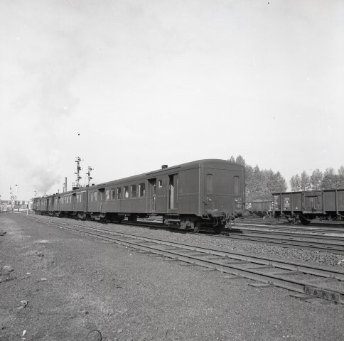 Drie M 1-rijtuigen staan uitgeweken in de sporenbundel van station Manage. Het gaat over een rijtuig tweede klas (B), een rijtuig eerste en tweede klas (AB) en een rijtuig tweede klas met bagageafdeling (BD). Rechts staan enkele stortwagens in de bundel. In de achtergrond zien we enkele mechanische seinen.