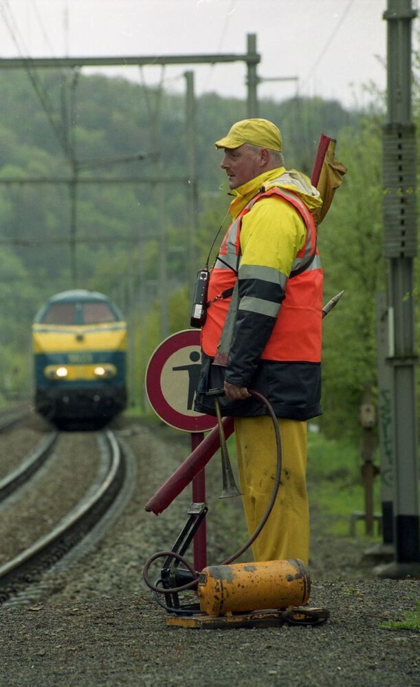 De fotogroep bevat 106 negatieven. Ze tonen een spoorleggersploeg aan het werk op spoorlijn 43. Terwijl enkele arbeiders een apparaat bedienen om de bouten van de sporen los te draaien en vast te zetten, staat de schildwacht op uitkijk. Hij draagt een hoorn, seinvlaggen en walkietalkie om bij gevaar te kunnen waarschuwen. Aan zijn voeten ligt een toeter die op geperste lucht werkt. Alle arbeiders dragen fluoriserende kledij en veiligheidsschoenen. Op het moment van de opnames passeerde diesellocomotief 5523 de onderhoudswerken.