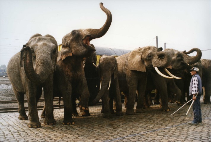 De foto toont zeven olifanten en een begeleider op de laadkoer van station Gent-Sint-Pieters. Daarachter staan enkele goederenwagens. Het gaat hier waarschijnlijk om een transport van een circus.