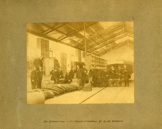 Het personeel poseert op verschillende plaatsen in een werkplaats. Op de voorgrond liggen houten wielen en zien we een spoor. In de achtergrond staat vermoedelijk een houten bakwagen.