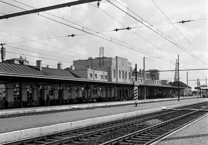 Deze fotogroep bestaat uit twee negatieven. Ze tonen het station met luifel aan de kant van de sporen. Het centrale deel met de inkomhal bestaat uit twee bouwlagen. Het wordt geflankeerd door twee vleugels met één bouwlaag onder een zadeldak. De deuren en ramen hebben bovenaan ronde bogen. Tegen de achtergevel hangen affiches en een stationsklok. De perrons zijn met elektrische verlichting, luifels, naamborden, spoornummers en een onderdoorgang uitgerust. Op foto A staan naast de spoorlijn mistbakens. Op de achtergrond zien we telefoonpalen, een watertoren en een installatie om het grondwater te ontkalken.