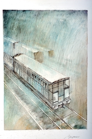 BeschrijvingDeze tekening werd in donkere grijs- en groentinten met enkele bruine accenten uitgevoerd. Centraal staat een GCI-rijtuig tweede klas op een spoor tijdens een zware regenbui. Daarachter werden andere rijtuigen schetsmatig weergegeven.